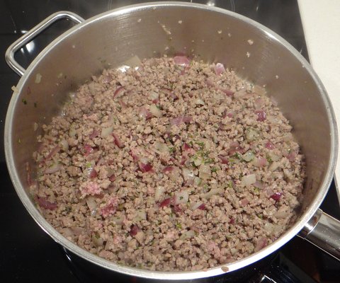 When the pink color is gone, add a glass of red wine (optional) and cook, stirring, until most of the wine has evaporated.