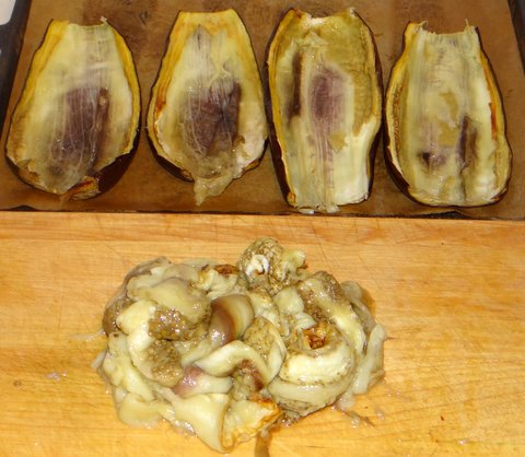 Sprinkle the eggplant skins with salt and reserve them. Roughly chop the pulp.