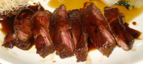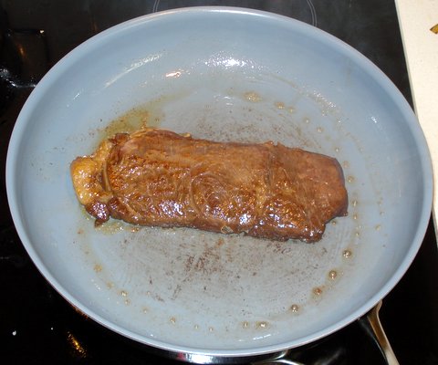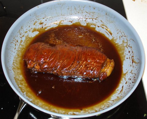 Briefly return the steak to the pan to cover it with a teriyaki glaze on all sides.