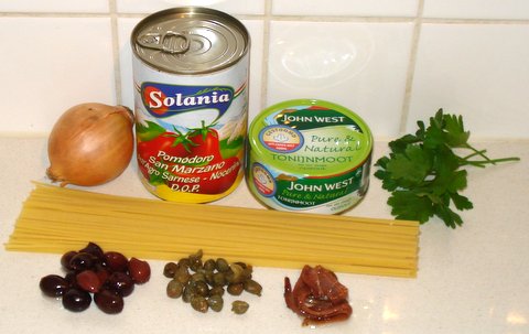 This is my “go to” recipe for un unplanned but tasty and healthy meal, as all the ingredients have a very long shelf life (so I usually have them available) and it doesn’t matter to leave out some of the ingredients. The only things you really need are spaghetti, a can of tuna, a can of peeled tomatoes, salt and olive oil. The taste will be more complex if you do use all the optional ingredients, but it will still taste fine without them or with just a few of them. Another advantage of this dish is that it takes only about 15 minutes to make.