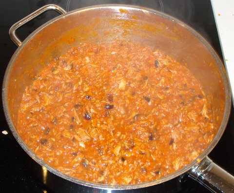 Add the tomatoes and the olives as soon as most of the wine has evaporated. Cook over medium heat, stirring to let the sauce thicken.