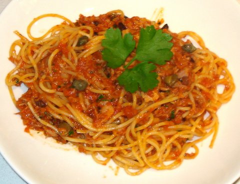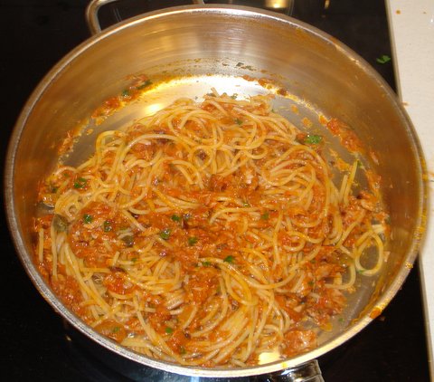 Drain the spaghetti and add it to the sauce together with the capers and the parsley. Toss to mix.