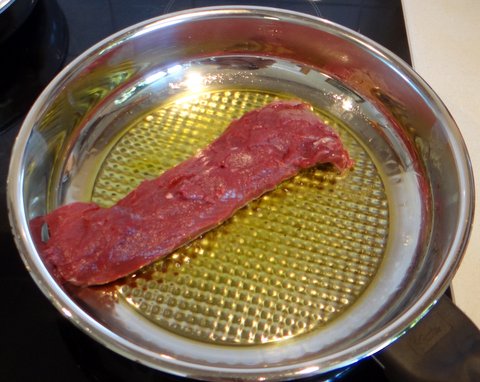 Although you can see the seal on the roe deer back that means it had been certified as healthy and I took it off the bone myself, to be on the safe side I seared it very quickly on all sides in a very hot frying pan with olive oil to kill any outside contamination. This was probably overcautious since the intact muscle of a healthy animal is sterile.