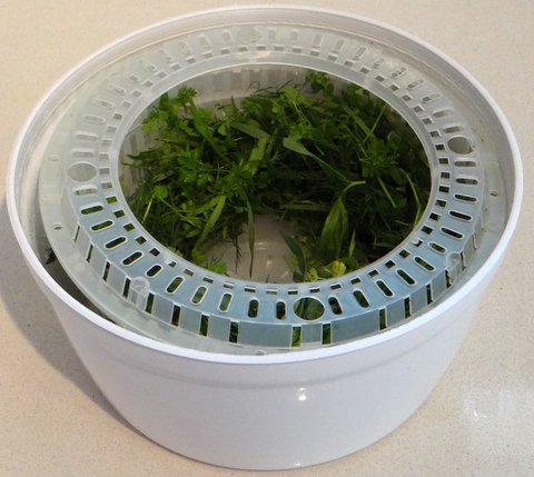 I then dried the leaves in a salad spinner. (If you don’t have one I recommend buying one, as fresh salad that you wash and cut yourself is so much better (not to mention cheaper) than the pre-cut pre-washed salad from the supermarket.)