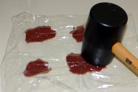 …and then gently pounded it thin between two sheets of plastic wrap with a rubber hammer that is normally used by road workers.