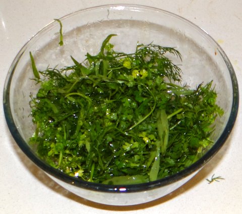 To prepare the herb salad, I carefully removed all the tough stems of the herbs and washed the leaves in cold water.