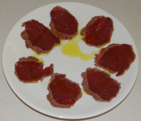 I then arranged the pounded slices on individual plates, drizzled some very good extra virgin olive oil on it and seasoned lightly with salt and freshly ground black pepper.