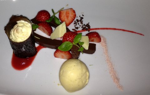 Chocolate, champagne sabayon, vanilla ice-cream and strawberries