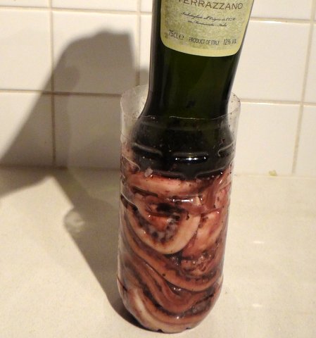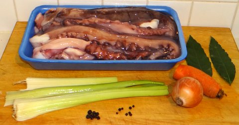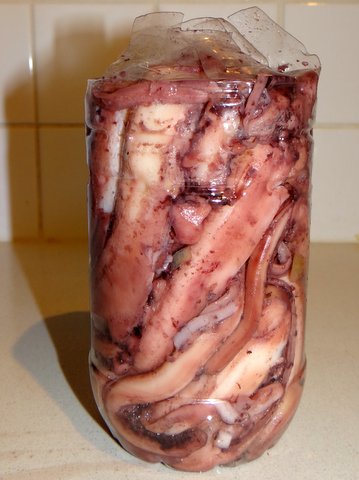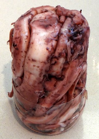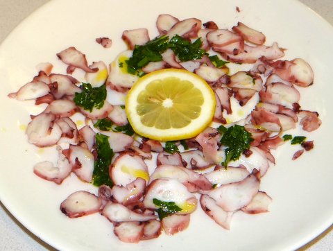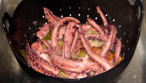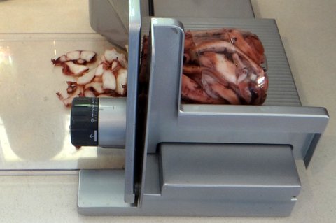 Octopus can be very tough and bland, but when you cook it sous-vide it will be tender and flavorful. I wrote about sous-vide octopus (Insalata di Polpo) before, but since octopus sous-vide is so good and I saw a nice idea on GialloZafferano that enables you to slice the octopus more thinly, I decided to write about it some more. The photos on GZ suggest that you can actually get slices of octopus ‘sausage’, but since there is no ‘glue’ to hold them together that doesn’t happen and the slices fall apart. It still looks great, and the thin slices make the octopus even more tender. It would be nice to think of something to make them stick together, because it would look even nicer that way.