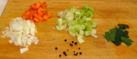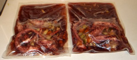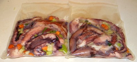 Season the octopus ligthly with salt. Put the octopus in 1 or 2 sous-vide pouches with the onion, carrot, celery, bay leaves, juniper berries, and pepper corns. I used zip pouches because the octopus releases a lot of liquid and can therefore be difficult to seal with a FoodSaver-type vacuum sealer.