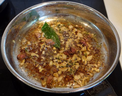 Add the chopped shallot, 1 bay leaf and a chopped garlic clove to the fat and sauté for 1 minute.