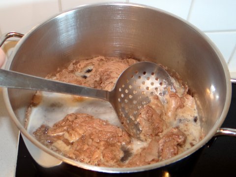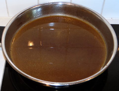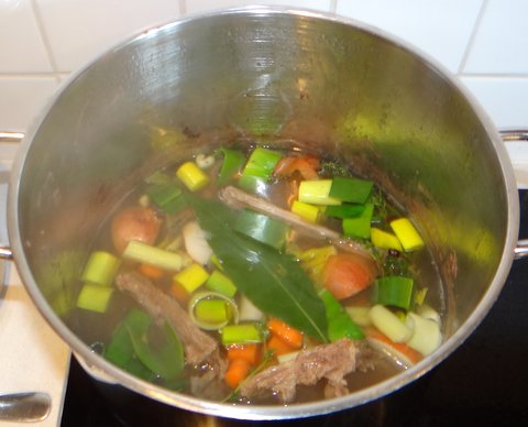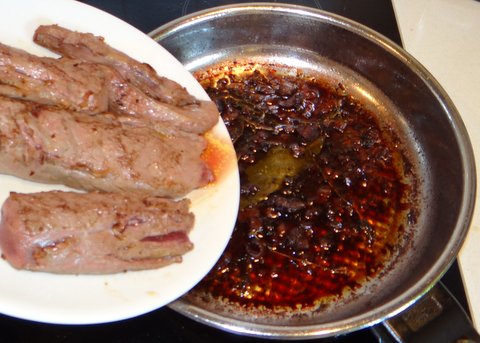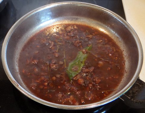 Add the juices that will have leaked out of the browned venison. Add the contents of the frying pan to the stock pot.