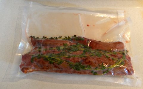 Seal the venison with thyme sprigs. If using a FoodSaver-type vacuum sealer like I do, leave a long ‘sleeve’ to prevent the vacuum sealer from sucking the juices out of the bag. Refrigerate the bag until you are ready to cook it sous-vide. Cook sous-vide for 1,5-2 hours at 53C/127F.
