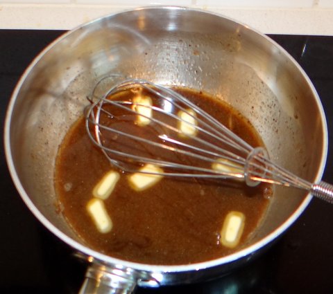 When the jus has thickened to your liking, taste and adjust the seasoning with salt and freshly ground black pepper. Whisk some small pieces of cold butter into the jus to make it thicker and shiny, this is called mounting with butter.