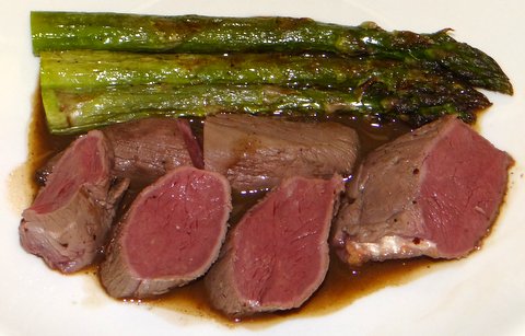 Take the venison out of the sous-vide pouch. Discard the thyme. Slice the venison in thick slices. Serve on hot plates with the jus and vegetables of your choice. Season very lightly with salt to enhance the flavor of the venison. I served it with roasted asparagus (tossed in extra virgin olive oil, salt and freshly ground black pepper and roasted for 15-20 minutes at 225C/450F).