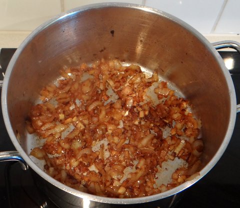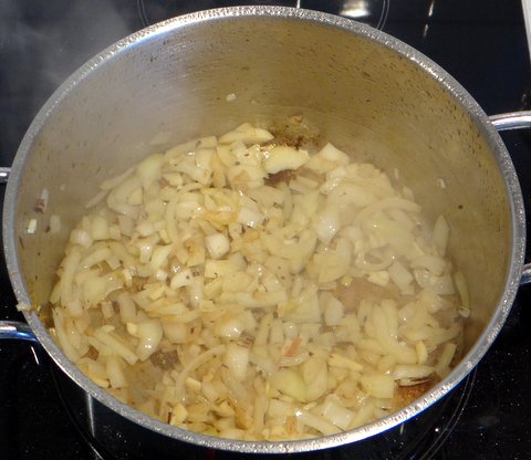 Take out the beef and add the onions and garlic to the fat. Cover with a lid and let sweat over low heat for 20 minutes.