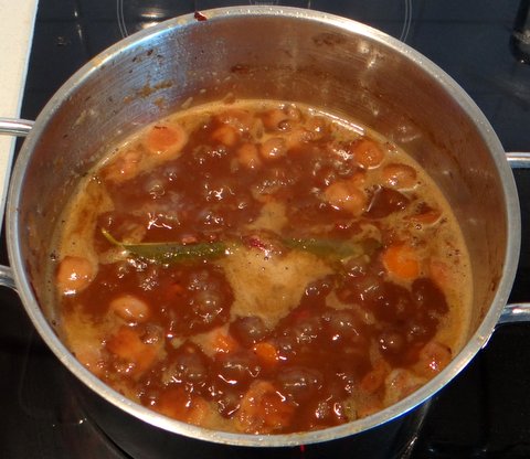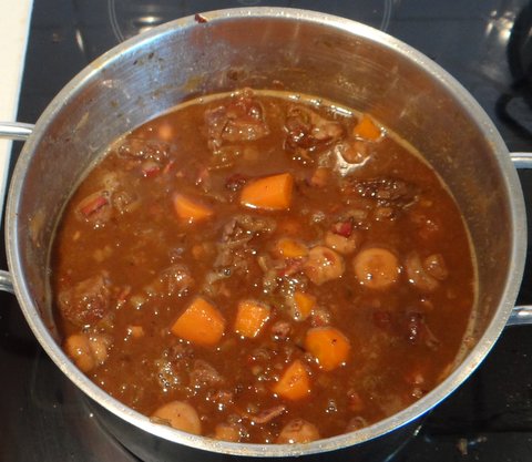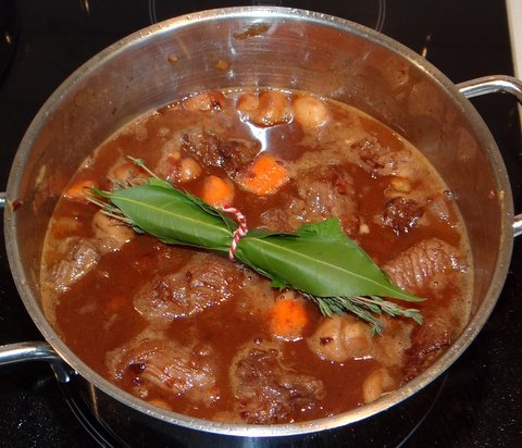 Now add back the beef (including all the juices that leaked out) and add the beef stock, the red wine, a bit of salt, and a bouquet garni. A bouquet garni is thyme, parsley and bay leaf bound together so it will be easier to take it out at the end of the cooking. (The bouquet garni is on top of the stew in the picture, but I submerged it after taking the picture). Bring this to a boil.