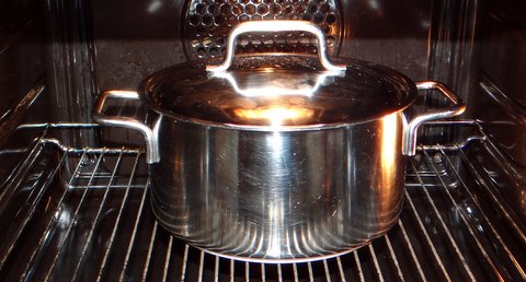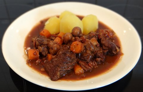 As soon as it boils, cover with a lid and put in the oven at 70C/160F until the beef is tender. It was dinner time after 6 hours and the beef was allright, but next time I will leave it in even longer. Putting it in the oven is the easiest way to maintain a temperature of the stew of about 65-70C/150-160F. A higher temperature will make the beef dry, especially if you use lean beef like I did.