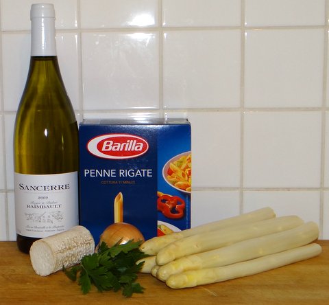 On to today’s recipe. I blogged about risotto with asparagus and goat cheese before, but my original recipe was pasta with asparagus and goat cheese. This is just as delicious, but easier and quicker to make than risotto. I love the combination of asparagus, goat cheese and Sancerre (or other dry sauvignon blanc) so much that this is always a winner. Use a tasty goat cheese for this, as it is an important factor in the success of this dish.