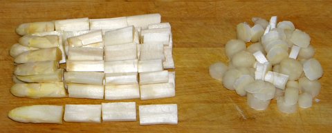 Cut about 5 cm (2 inches) from the bottom of the asparagus and cut into thin slices.