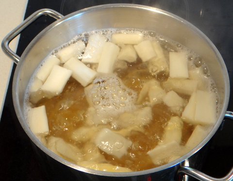 Put the slices asparagus bottoms into the blender. (Slicing them is a precaution to make sure there will be no long fibers in the asparagus puree.)