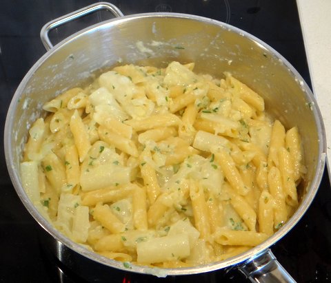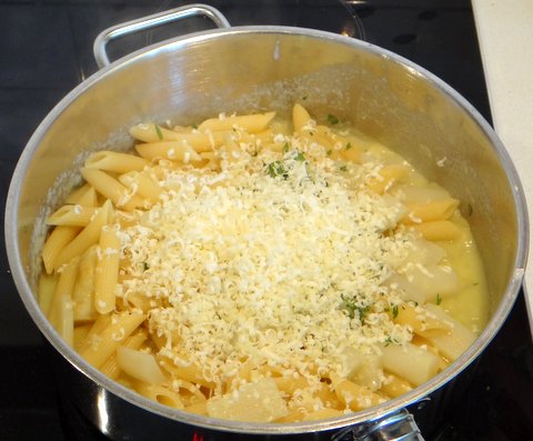 When the pasta and asparagus are cooked, drain in a colander and add to the sauce. Add freshly grated goat cheese and chopped parsley.