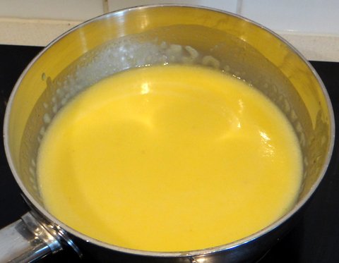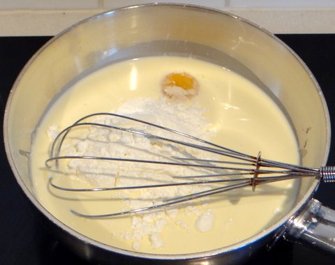 Put the whipping cream, the egg yolks, and the corn starch in a saucepan. Heat over medium-low heat, beating to avoid lumps.