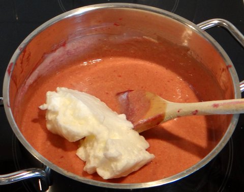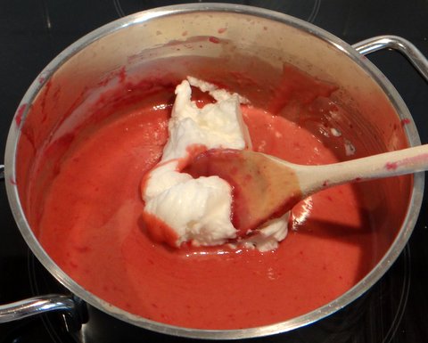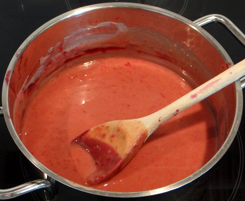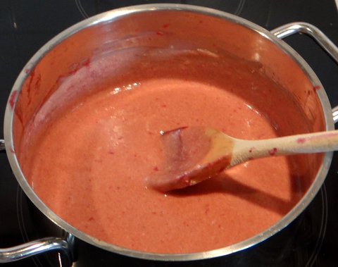 Add 1/4 of the egg foam to the raspberry mixture.