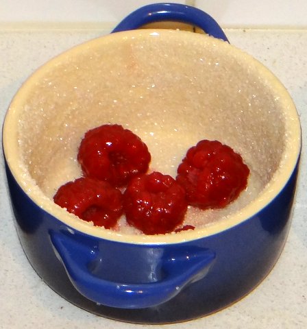 Divide half the macerated raspberries over the ramekins.