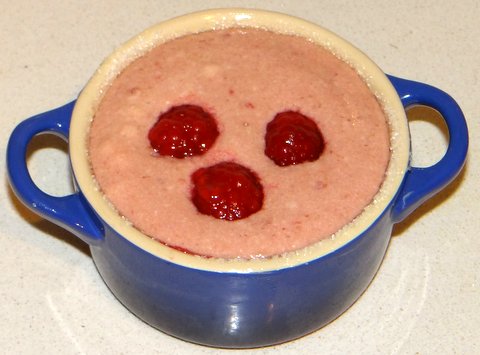 Soufflés have a reputation of being difficult, but they are not that hard and extremely festive. Just remember that they will fall no matter what you do as soon as they cool, so serve them as quickly as possible. We got a raspberry soufflé for breakfast at Librije’s Hotel a few weeks ago, and I liked it so much that I decided to create my own. I don’t have their recipe, this is something I created myself by mixing and matching various recipes for other soufflés that I found in various sources. I also used Harold McGee‘s advise for making soufflé. The soufflés turned out great! And I also discovered that you can refrigerate the soufflé up to 24 hours before baking it, so this is great to prepare beforehand and just pop into the oven half an hour before you’d like to surprise your guests! You can make this with frozen raspberries which are cheaper than fresh and available year-round.
