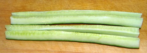 Wash and dry the outside of the cucumber. Halve lengthwise and scoop out the seeds with a spoon.