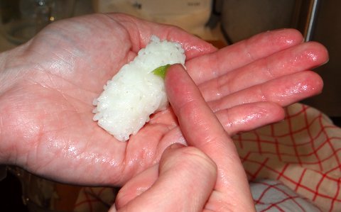 Press the rice into shape, making sure that it will stick together but do not mash it.