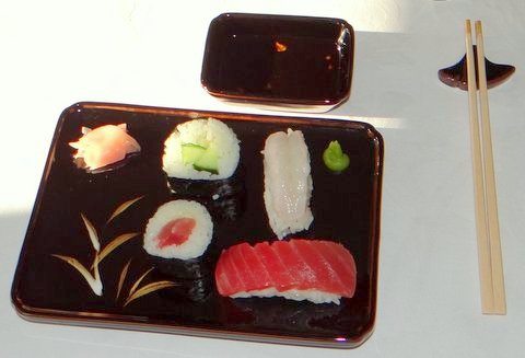 Making sushi together is a lot of fun, and although the sushi will probably not be as good as sushi at a specialized sushi restaurant, home-made sushi will taste much better than ready-made refrigerated sushi. It is not a coincidence that I like Japanese food besides Italian, as both rely to a great extent on the quality of the ingredients. This also applies to sushi: the quality of the rice, nori seaweed, wasabi, soy sauce, pickled ginger, and last but certainly not least the fish all make a difference. Your skill will define how the sushi will look, but the taste will to a great extent depend on getting the right stuff. And thus it pays off to go to a specialized store to obtain the ingredients, rather than picking them up from the local supermarket. Always tell your fishmonger that you will eat the fish raw, so that he can advise which fish is the fresh enough to eat raw.