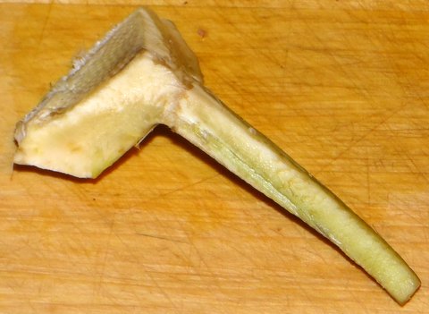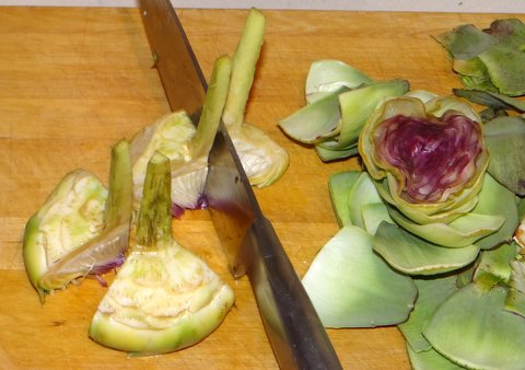 It is now easy to cut out all the ‘hay’, and all the other tough green bits. You won’t have much left, but that’s how it is with artichokes.