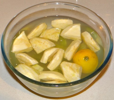 Put the artichoke quarters in a bowl of water with half a lemon, that you squeezed into the water before adding the lemon itself as well. The vitamin C from the lemon prevents the artichokes from turning brown and can even change the color back to white if they do turn brown a little.