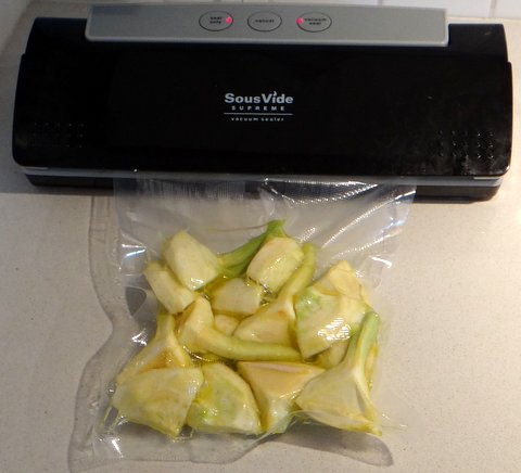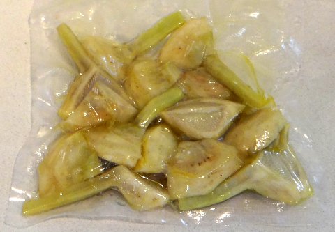 Preheat the water bath to 84C/183F. Dry the artichokes with paper towels and vacuum seal them with some good extra virgin olive oil and a bit of salt.