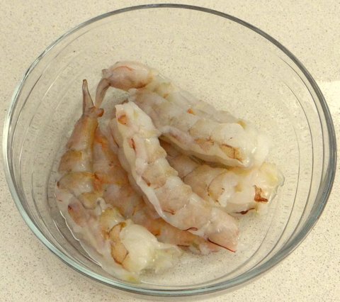 To prevent shrimp from curling, make a few incisions along the belly (being careful not to cut your hand), making sure not to cut the shrimp.