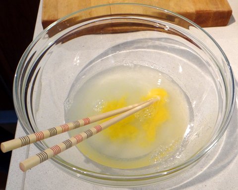 Combine the ice cold water and the egg yolk in a bowl and mix just a bit.