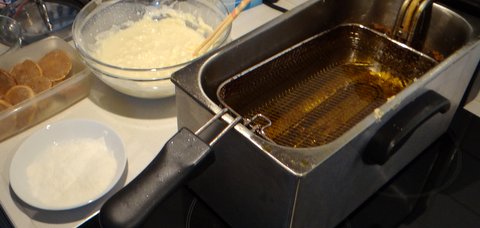 Heat the oil for frying to about 170C/340F. It is best to use a pan on the stove for a more even temperature, but I used an electric fryer anyway since it is easier to handle (and if you have a gas stove it would also be a fire hazard).