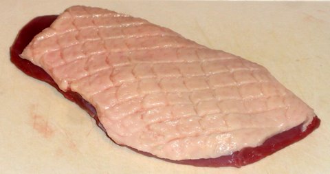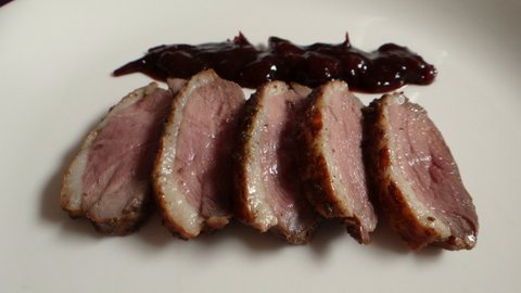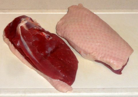 For this recipe you need tender fresh duck breasts. Do not use frozen duck breasts, since freezing the meat will give it a ‘livery’ taste and make it less juicy. In the USA for tender duck breast pick the Pekin variety if you have the choice rather than Moullard or Muscovy since Pekin is more tender; the others are by-products of the foie gras industry.