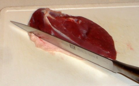 Optional step: lay the breast down on the fat side and cut away any fat that sticks out.