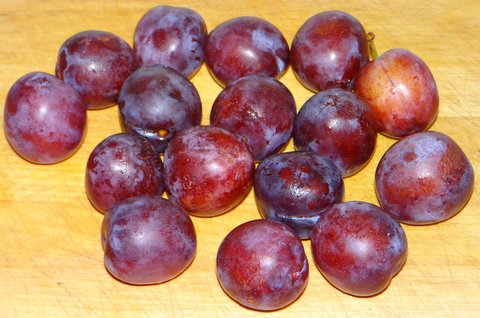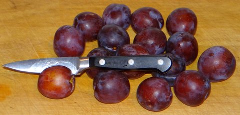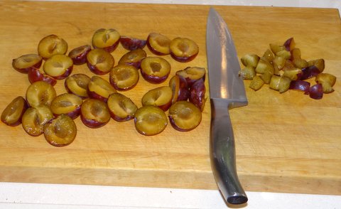 Rinse and dry the plums. Pit them by cutting around each plum with a sharp knife.