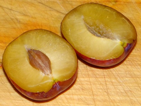 You can now easily separate the halves. One will have the pit that you should be able to remove easily with your fingers. If it’s stuck, your plums were not ripe! (Plums continue to ripen after they have been picked, so it pays off to wait if needed.)