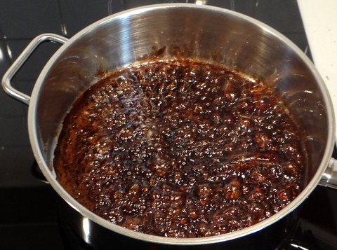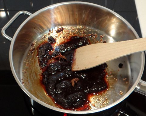 Put the brown sugar in a frying pan and add just enough water to dissolve it (i.e. only a few tablespoons).
