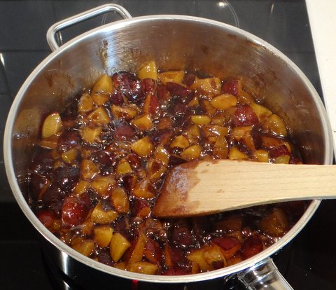 Add the chopped plums as soon as you see large bubbles, otherwise the caramel will burn. (If that happens, just start over.)