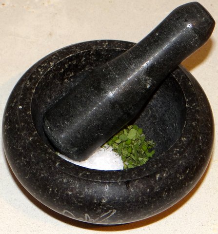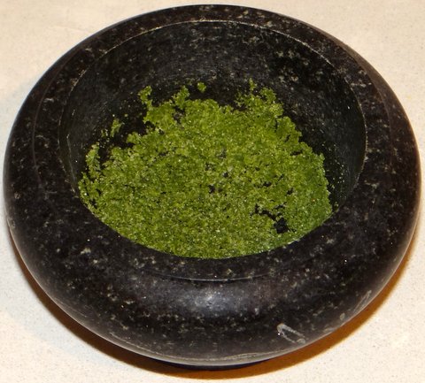 Grind and pound until you obtain green salt. It will be a bit sticky, that’s okay.