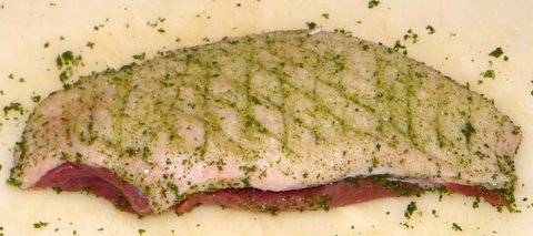 Score the fat side with a sharp knife to create a crosswise pattern. Make sure not to pierce the meat underneath. This scoring helps to render the fat.