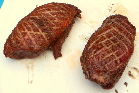 Put smoking dust into the smoker (about 2 Tbsp). Insert the probe of an instant read thermometer (if you have one) in one of the duck breasts, making sure that the tip of the probe is in the center of the meat where it is thickest. Put the duck in the smoker with the skin side up.