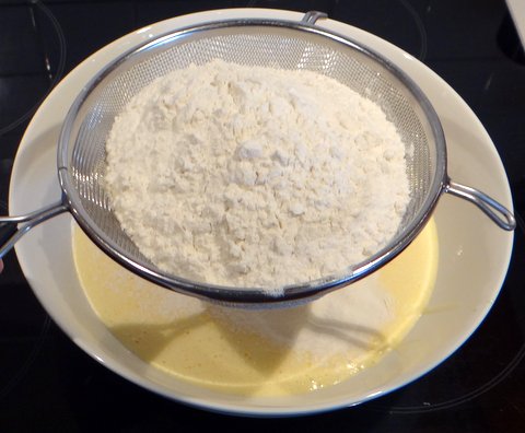 Transfer the egg mixture to a bowl. Sieve flour and baking powder into the bowl.