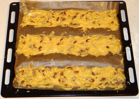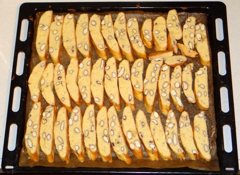 Put the cantuccini back on the baking sheet with one of the cut sides down. Bake for 12 minutes at 175C/350F. Turn the cantuccini around and bake for another 8 minutes.